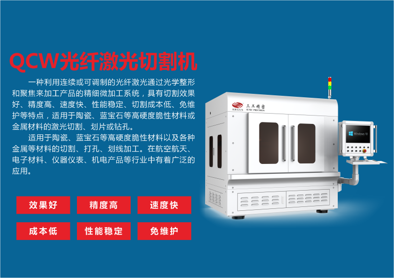 一種利用連續(xù)或可調(diào)制的光纖激光通過光學(xué)整形和聚焦來加工產(chǎn)品的精細微加工系統(tǒng),具有切割效果好、精度高、速度快、性能穩(wěn)定、切割成本低、免維護等特點,適用于陶瓷、藍寶石等高硬度脆性材料或金屬材料的激光切割、劃片或鉆孔。適用于陶瓷、藍寶石等高硬度脆性材料以及各種金屬等材料的切割、打孔、劃線加工。在航空航天、電子材料、儀器儀表、機電產(chǎn)品等行業(yè)中有著廣泛的應(yīng)用。